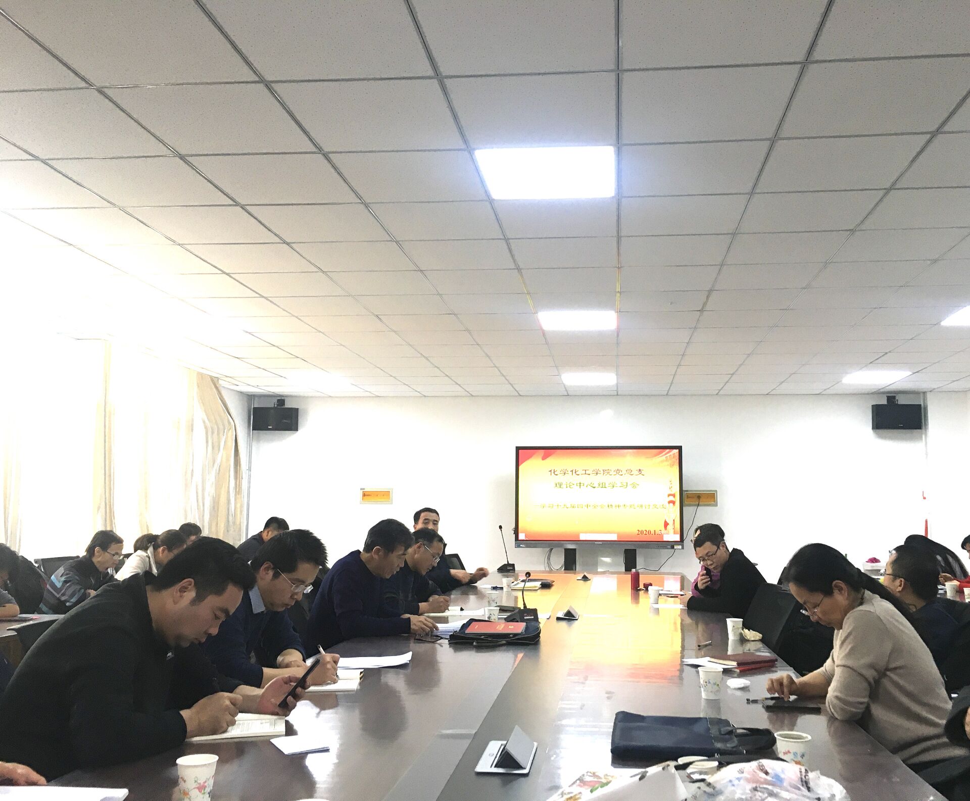 2020年1月3日在化学实验楼二楼会议室,英国上市公司官网365党总支理论中心组召开学习贯彻党的十九届四中全会精神专题研讨交流会,部分教师代表列席会议。