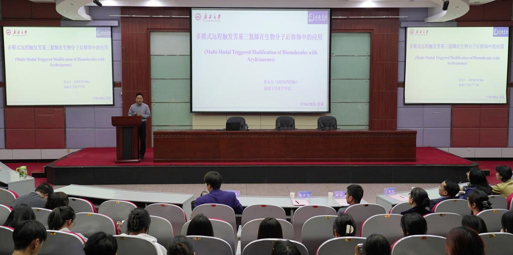 报告会上,学院负责人对张永红教授和胡金豆博士的到来表示欢迎,并简要介绍了两位校友的成就和贡献。张永红教授做了题为《多模式远程触发芳基三氮烯在生物分子后修饰中的应用》的报告。详细介绍了其研究团队在生物分子后修饰领域的研究进展,以及多模式远程触发芳基三氮烯在这一领域的应用。